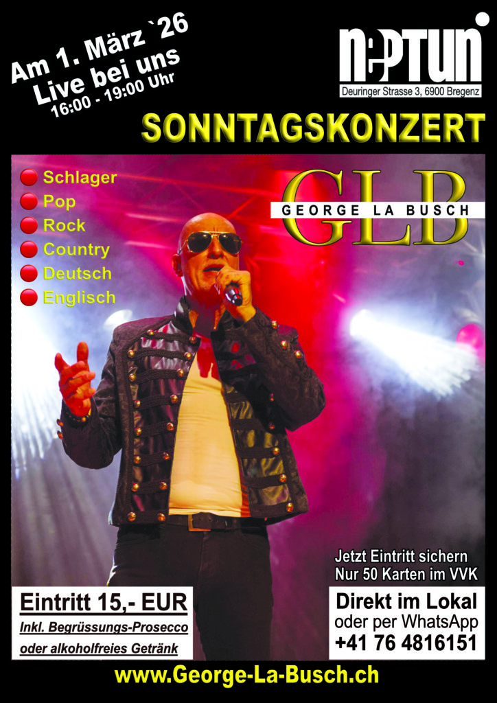 Eintrittskarten für „Sonntagskonzert“, am 1. März 2026, in Bregenz Music DownloadCD-BestellungKonzertkartenAutogrammkarten Termin: Sonntag, den 1. März 2026, Einlass 14:00 Uhr – Beginn 16:00 Uhr Ort: Neptun Bar, Deuringer Straße, AT 6900 Bregenz Bitte aktiviere JavaScript in deinem Browser, um dieses Formular fertigzustellen.Karten für Konzert am 01. März 2026 in Bregenz - je 15.00 EUR (Inkl. Begrüßungs-Prosecco oder ein alkoholfreies Getränk) *Hier die Anzahl der Eintrittskarten wählen12345678910Name *VornameNachnameAdresse *Strasse, Haus-Nr.Ort *Postleitzahl, OrtTelefon *Telefonnummer - Ohne Leer- und SonderzeichenE-Mail *Kommentar oder NachrichtKartenbezug bitte hier auswählen - Wir senden anschliessend die RechnungsinformationenIch hole die Karte/n innerhalb der nächsten 8 Tage im Veranstaltungslokal (Neptun Bar, Deuringer Straße 3, AT 6900 Bregenz, ab.Ich möchte die Karte/n per Post erhalten. (+ 2.50 EUR Versandkosten)Ich zahle die Karten jetzt und nehme sie beim Eintritt in das Lokal an.Bei Auswahl: Abholung im Veranstaltungslokal (Falls die Abholung nicht innerhalb von 8 Tagen erfolgt, verfällt diese Reservierung automatisch.)CommentAbsenden